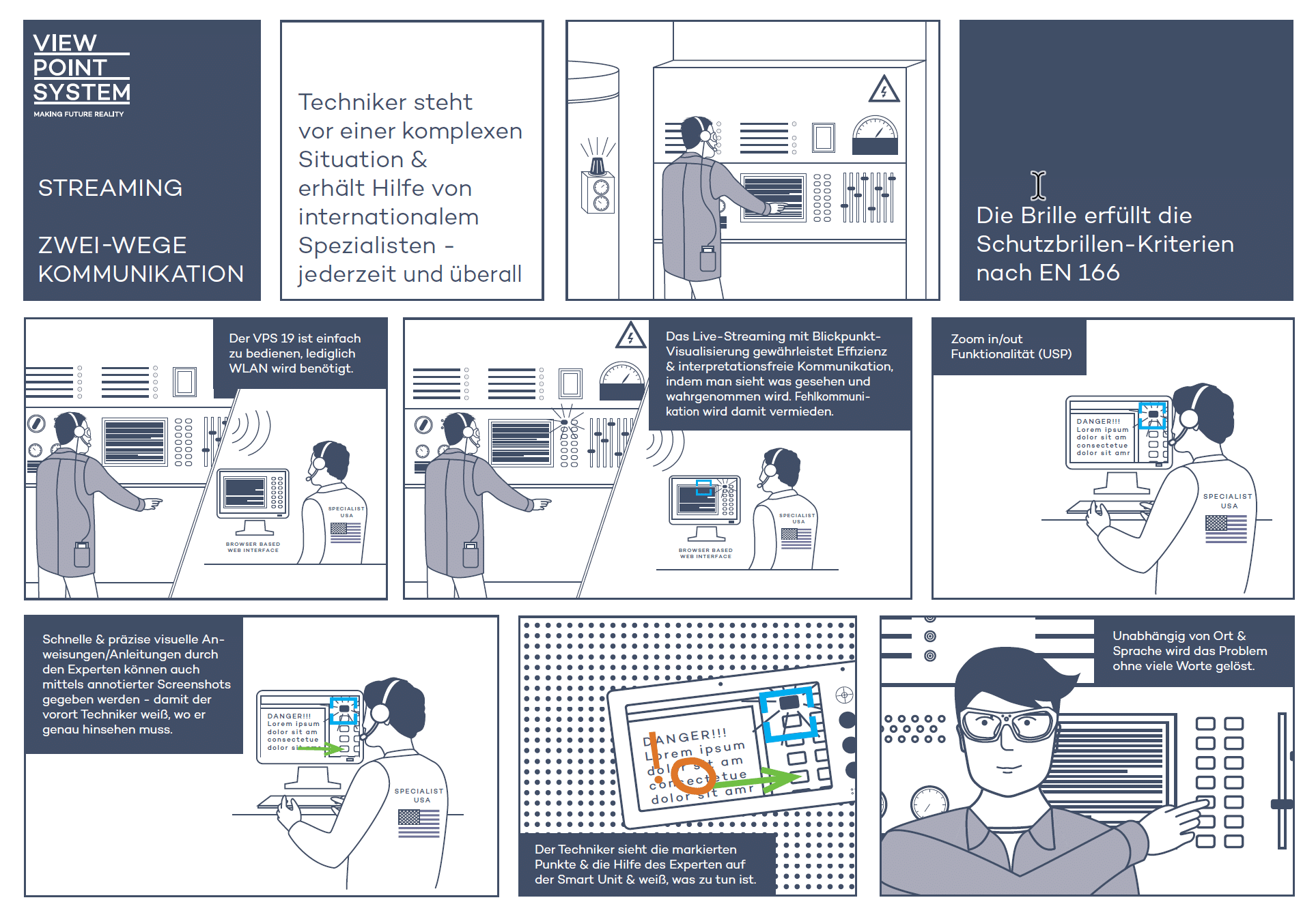 Bei einem Maschinenschaden brauchen Techniker vor Ort sofort Unterstützung von Experten. Mit VPS 19 Smart Glasses schalten Sie diese innerhalb von Minuten zu. Sofort kann der Experte exakte Anweisungen geben, auch bei Sprachbarrieren, im lauten Umfeld oder in schlechten Lichtverhältnissen.
