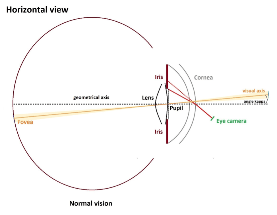Unser digitaler Zwilling muss bestimmte Annahmen über die Anatomie der Augäpfel des Trägers treffen, etwa den Winkel κ zwischen der geometrischen und der visuellen Achse (siehe Abbildung 1) oder die Krümmung der Hornhaut. Statt trägerspezifischer Daten verwenden wir hierfür Werte für ein normales gesundes menschliches Auge und liefern so eine auto-kalibrierte Vorhersage des Blicks des Trägers. Die Genauigkeit dieses automatisch kalibrierten Blicks liegt in der Regel bei 2° und kann bis zu 1° betragen. Der psychophysische Zustand des Trägers und sein Fixationstraining haben einen erheblichen Einfluss auf die Genauigkeit.